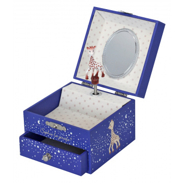 Open up this little musical jewellery box designed by Trousselier and turn the handle, Sophie la girafe will twist and turn to the soft music, captivating little ones. There is one smaller drawer at the bottom of the musical box to store extra precious little treasures !