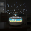Press the button on the front of the projector to start the projection and rotation. To conserve battery power, the projector automatically turns off after 15 minutes. Thanks to the cry-detection function, the nightlight will turn back on as soon as your baby starts crying. Activate the lullaby using the dial beneath the nightlight (plays for 2 minutes and 30 seconds).